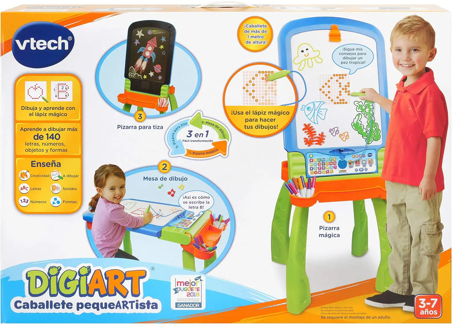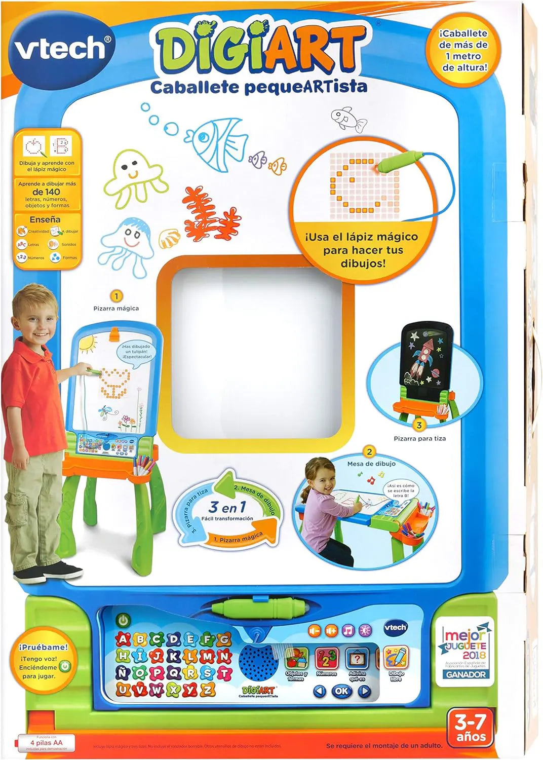 ¡Una superpizarra interactiva con música y voz! Pizarra electrónica que se transforma en tres juguetes: Caballete mágico, Pizarra para tiza y Mesa de dibujo.