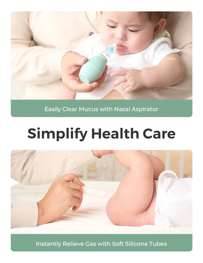 - Salud y Alivio: Incluye un aspirador nasal de silicona suave y tubos de alivio de gases (ayudan a liberar cólicos y gases atrapados de forma segura y eficaz).