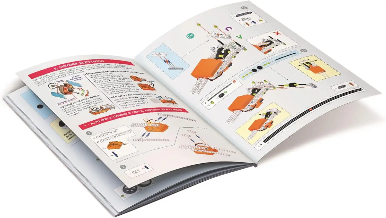 El kit incluye un manual científico ilustrado de gran formato. Este manual guía al niño de manera segura y detallada a través de cada fase de montaje, explicando los conceptos físicos detrás de cada engranaje. Es el apoyo perfecto para fomentar la autonomía y la satisfacción de decir: "¡Lo he construido yo!".