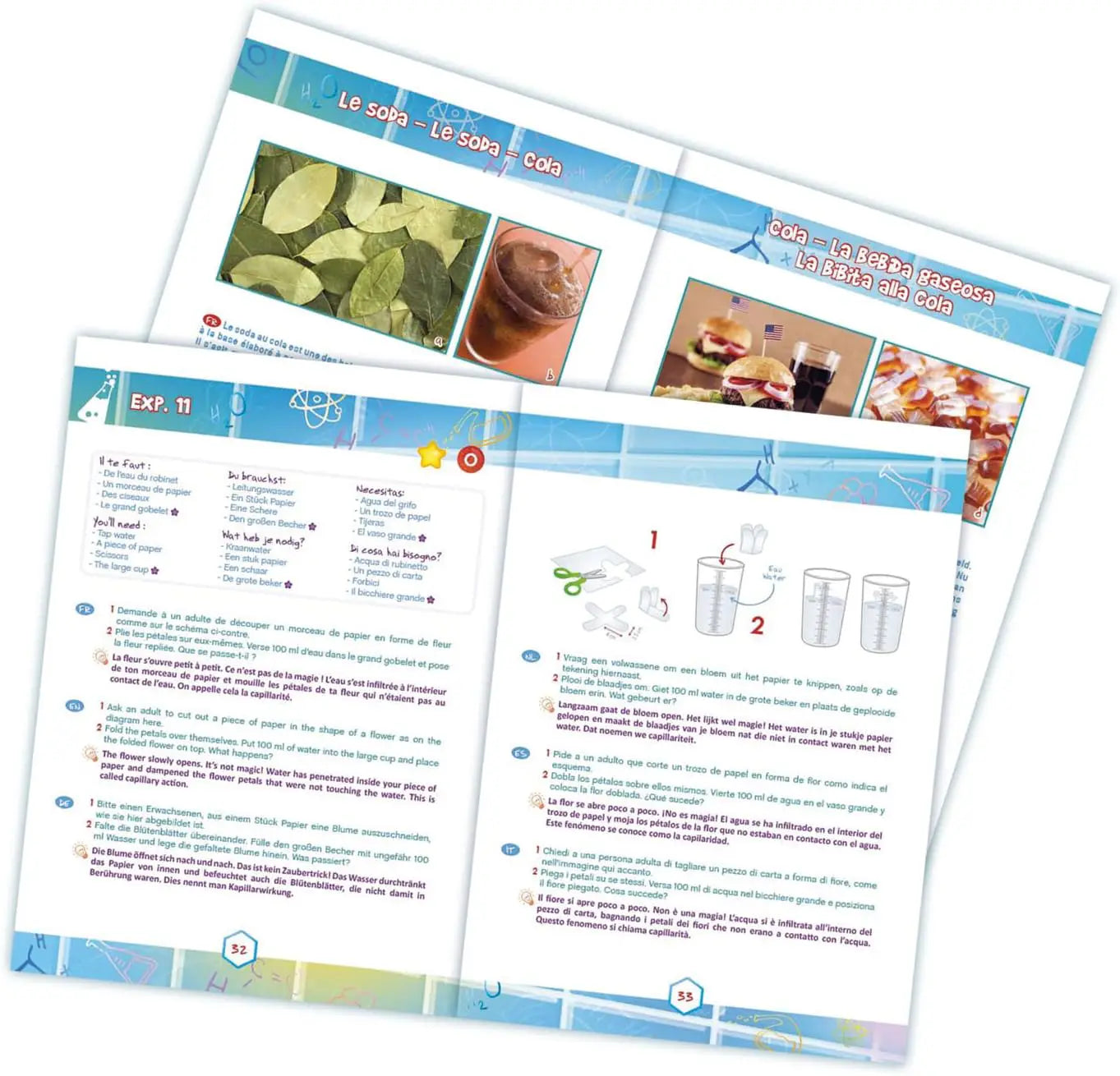Incluye más de 20 accesorios científicos, como tubos de ensayo con soporte, pinza, pipeta, vasos medidores, lupa, placas de Petri, embudo, globo, papeles de pH con escala y mucho más. El completo folleto ilustrado en color guía cada experimento paso a paso, facilitando la comprensión y reforzando el pensamiento lógico, la observación y la creatividad.