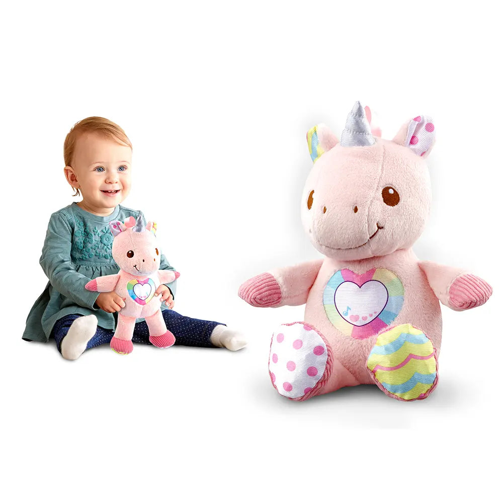 El unicornio cantarín de VTech se convertirá en el mejor amigo de los más peques de la casa, que no podrán dejar de acariciarlo por sus suaves texturas y sus entretenidas melodías. Pulsando su barriguita se activan frases y canciones, al tiempo que se ilumina a todo color.